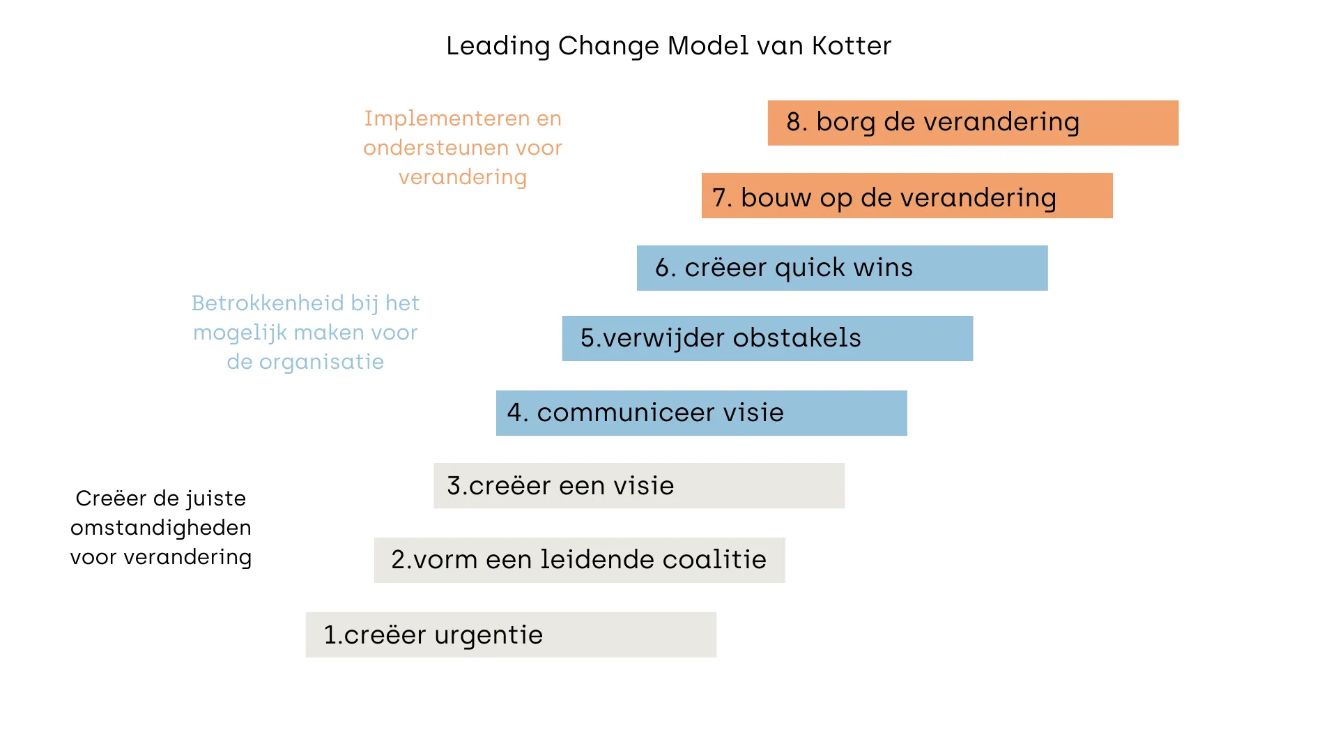 Hoe kan je verandering verankeren en omgaan met eventuele weerstand? Deze keer stelde de trainer het 8-stappen-plan “Leading Change” van Kotter voor om gestructureerd te werken aan verandering. In de eerste drie stappen creëer je de juiste omstandigheden voor verandering. In stap 4 tot en met 6 verbind je de verandering aan de organisatie. Voor de implementatie en consolidatie van de verandering hanteer je tot slot de stappen 7 en 8.